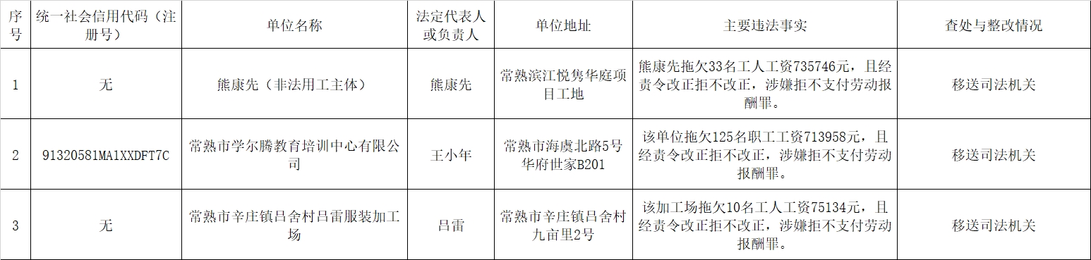 為貫徹落實《重大勞動保障違法行為社會公布辦法》(人社部令第29號)、《關于貫徹落實<重大勞動保障違法行為社會公布辦法>的通知》(蘇人社發〔2016〕405號)、《關于貫徹落實<重大勞動保障違法行為社會公布辦法>的通知》(蘇人保規〔2016〕18號)有關規定,健全用人單位勞動保障守法誠信檔案,督促和引導用人單位遵守勞動保障法律法規,現將以下重大勞動保障違法行為予以社會公布。
