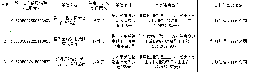 為貫徹落實《重大勞動保障違法行為社會公布辦法》(人社部令第29號)、《關于貫徹落實<重大勞動保障違法行為社會公布辦法>的通知》(蘇人社發〔2016〕405號)、《關于貫徹落實<重大勞動保障違法行為社會公布辦法>的通知》(蘇人保規〔2016〕18號)有關規定,健全用人單位勞動保障守法誠信檔案,督促和引導用人單位遵守勞動保障法律法規,現將以下重大勞動保障違法行為予以社會公布。