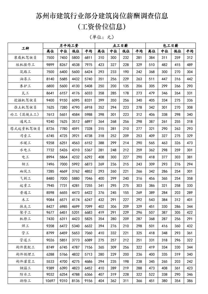 2022年度蘇州市建筑行業薪酬調查信息(工資價位信息)