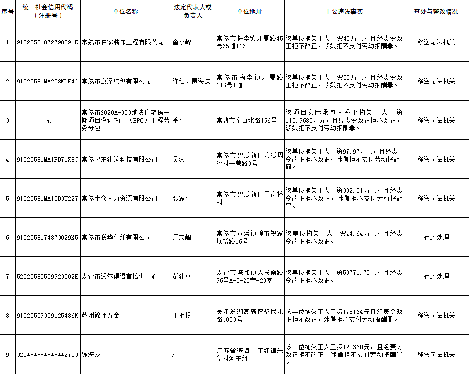 為貫徹落實《重大勞動保障違法行為社會公布辦法》(人社部令第29號)、《關于貫徹落實<重大勞動保障違法行為社會公布辦法>的通知》(蘇人社發〔2016〕405號)、《關于貫徹落實<重大勞動保障違法行為社會公布辦法>的通知》(蘇人保規〔2016〕18號)有關規定,健全用人單位勞動保障守法誠信檔案,督促和引導用人單位遵守勞動保障法律法規,現將以下重大勞動保障違法行為予以社會公布。