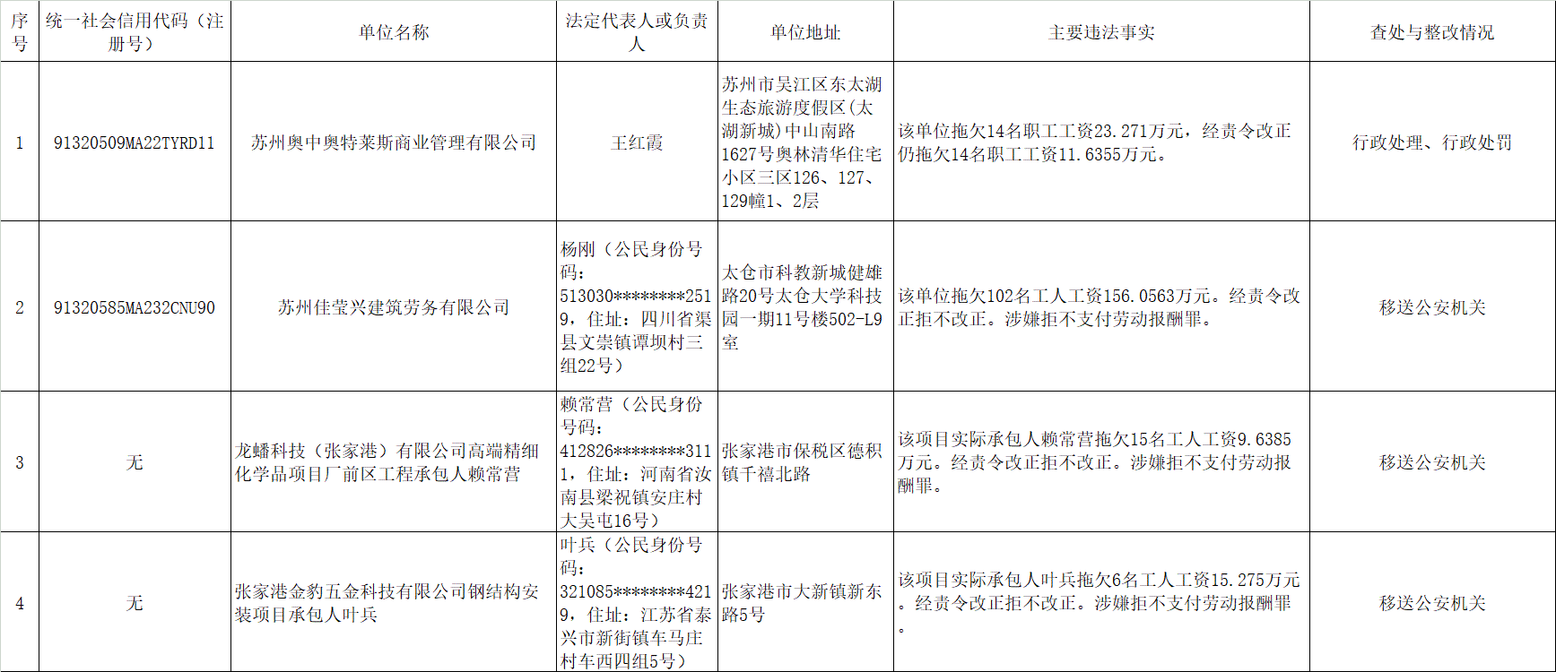 為貫徹落實《重大勞動保障違法行為社會公布辦法》(人社部令第29號)、《關(guān)于貫徹落實<重大勞動保障違法行為社會公布辦法>的通知》(蘇人社發(fā)〔2016〕405號)、《關(guān)于貫徹落實<重大勞動保障違法行為社會公布辦法>的通知》(蘇人保規(guī)〔2016〕18號)有關(guān)規(guī)定,健全用人單位勞動保障守法誠信檔案,督促和引導(dǎo)用人單位遵守勞動保障法律法規(guī),現(xiàn)將以下重大勞動保障違法行為予以社會公布。