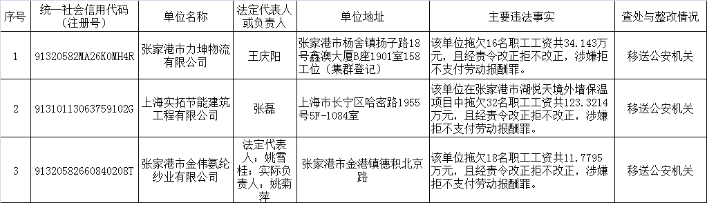 為貫徹落實《重大勞動保障違法行為社會公布辦法》(人社部令第29號)、《關于貫徹落實<重大勞動保障違法行為社會公布辦法>的通知》(蘇人社發〔2016〕405號)、《關于貫徹落實<重大勞動保障違法行為社會公布辦法>的通知》(蘇人保規〔2016〕18號)有關規定,健全用人單位勞動保障守法誠信檔案,督促和引導用人單位遵守勞動保障法律法規,現將以下重大勞動保障違法行為予以社會公布。