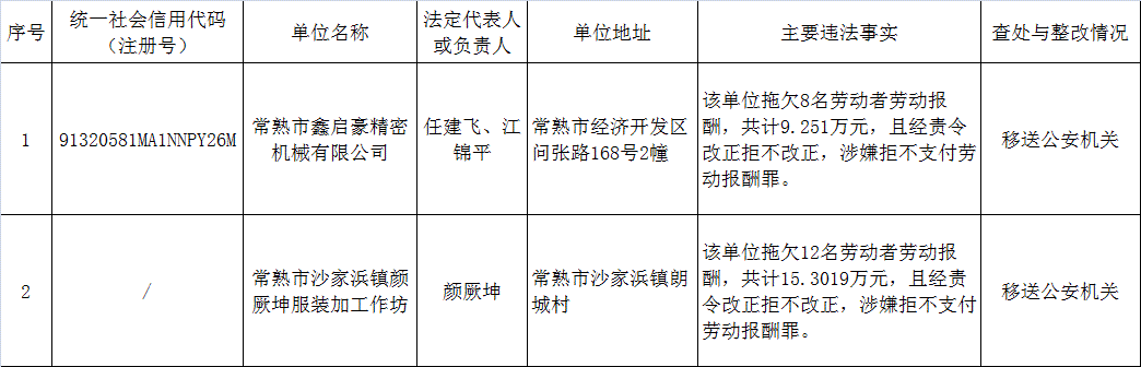 為貫徹落實《重大勞動保障違法行為社會公布辦法》(人社部令第29號)、《關于貫徹落實<重大勞動保障違法行為社會公布辦法>的通知》(蘇人社發〔2016〕405號)、《關于貫徹落實<重大勞動保障違法行為社會公布辦法>的通知》(蘇人保規〔2016〕18號)有關規定,健全用人單位勞動保障守法誠信檔案,督促和引導用人單位遵守勞動保障法律法規,現將以下重大勞動保障違法行為予以社會公布。