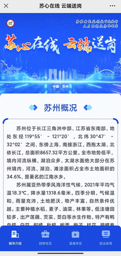 今年,蘇州人社還創新設立了“蘇心在線”招聘平臺,嵌入了城市介紹、招聘專區、直播回放、蘇州就業政策等功能模塊,幫助企業展示企業和崗位信息,幫助求職者了解蘇州就業友好用工環境、隨時隨地投出自己的簡歷,實現“蘇心在線云端送崗”2024直播季活動24小時不打烊。