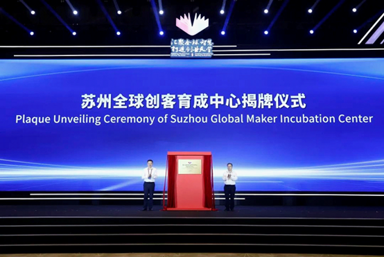 ▲江蘇省科協(xié)副主席方勝昔,蘇州市委常委、副市長顧海東為蘇州全球創(chuàng)客育成中心揭牌