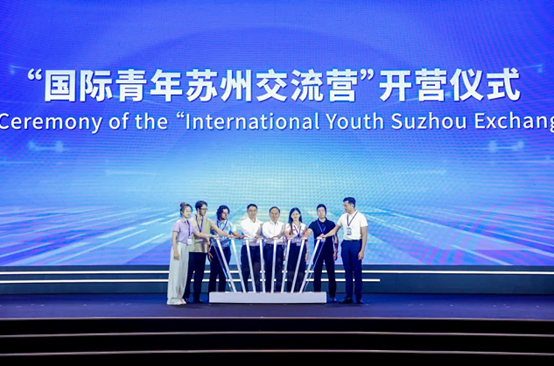 ▲團(tuán)省委副書記熊俊,蘇州市副市長查穎冬以及來自新加坡、美國、日本、俄羅斯和中國的青年人才代表為“國際青年蘇州交流營”開營