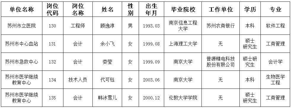 根據《蘇州市2025年市屬事業單位公開招聘工作人員公告》,經過筆試、面試、體檢和考核合格,擬錄用以下5名同志,現公示如下: